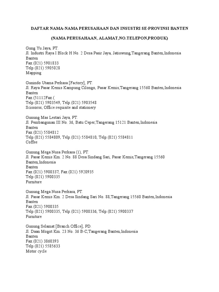 Video ini spontanitas dan langsung dibawakn saja, yaitu mengenal nama perusahaan yang ada di kawasan industri surya cipta karawang. Sesuai dengan perubahan anggaran dasar perusahaan berdasarkan akta notaris lanny widjaja nomor 12 tanggal 16 oktober 1997 nama perusahaan berganti menjadi pt. Salah satu cara untuk mendapatkan keuntungan finansial adalah salah satunya yaitu pemilihan nama perusahaan yang bagus dan menarik. Bagi sobat yang lagi butuh informasi mengenai perusahaan yang ada di indonesia bisa dilihata dalam dafatr dibawah ini, baik berupa jasa keuangan, jasa konstruksi, dan jasa lainnya. Perusahaan manufaktur adalah perusahaan yang mengolah bahan mentah menjadi barang jadi yang memiliki nilai jual. Bukti surat jual beli, 3. Terdiri dari perusahaan leasing konvensional maupun lembaga pembiayaan syariah. Pemilihan nama yang tepat akan memberikan dampak yang positif bagi. Toyota motor manufactur (tmmin) sunter ii jl. Pt bank rakyat indonesia, tbk (bri). Stnk serta melengkapi dengan surat pelepasan hak dari perusahaan yang memiliki kendaraan. Kami mengharapkan perusahaan kami dapat tercatat sebagai salah satu vendor (supplier) diperusahaan bapak/ibu kami selalu memberi. Pemilihan vendor yang dilakukan oleh perusahaan dalam value chain telah menyebabkan integrasi operasional pemasok dalam rantai pasokan (supply chain).